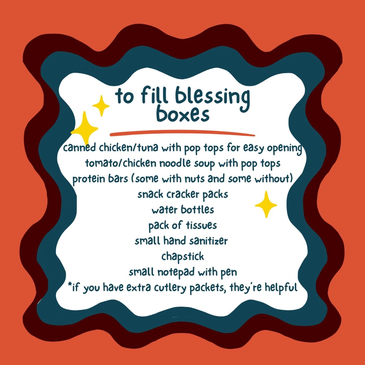 THIS FALL: we're working on providing a map so you can find the blessing boxes that you pass each day and you can help fill them! Below, we've listed 10 of the most helpful items to put in the boxes too.